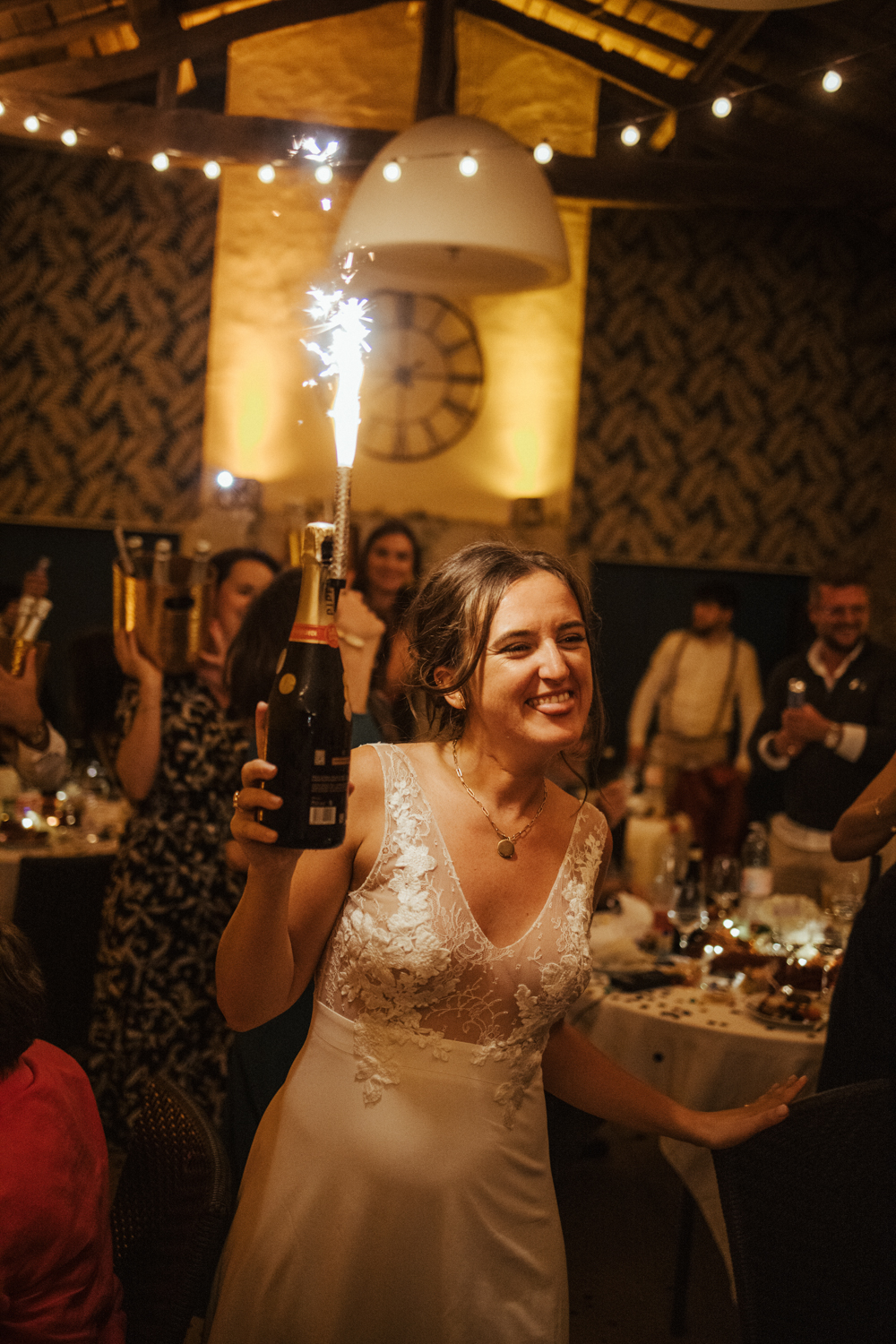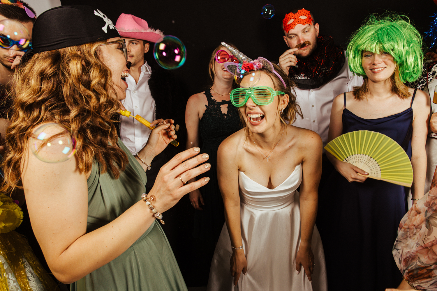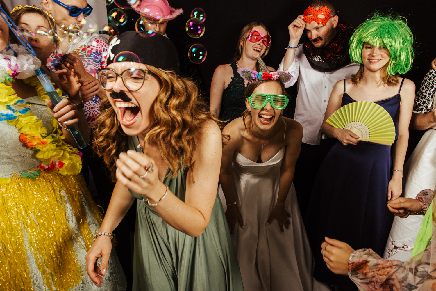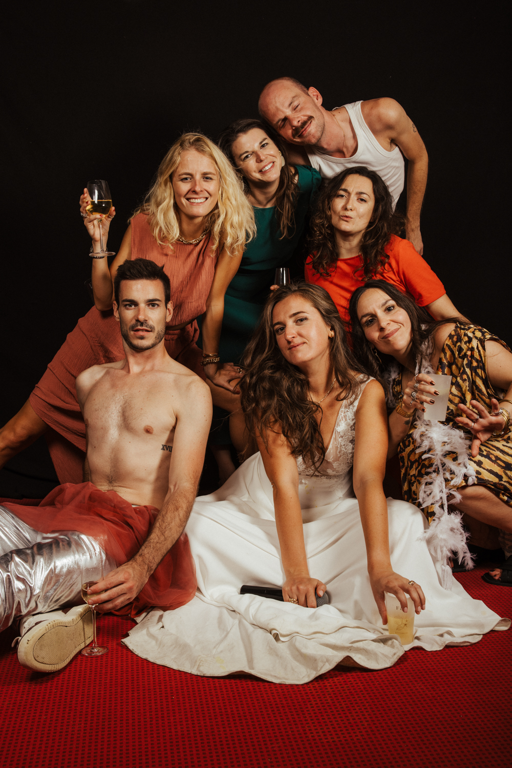 Le soir, je propose une prestation peu courante dans la photographie de mariage: le studio photo. Constitué d’un fond et de deux torches (Elinchrom D-Lite RX4) munies de boîtes de lumière, ce dispositif a le double avantage de produire des photos classes et élégantes d’inspiration Harcourt et des photos de soirée plus décalées avec un maximum de personnes. Avec cette formule, j’assure non seulement à mes clients des photos de soirée de qualité (ce qui est rarement le cas dans un contexte de basse lumière) mais aussi une animation qui fait fureur et lance le dancefloor. Surtout si vos invités cèdent aux sirènes du déguisement.