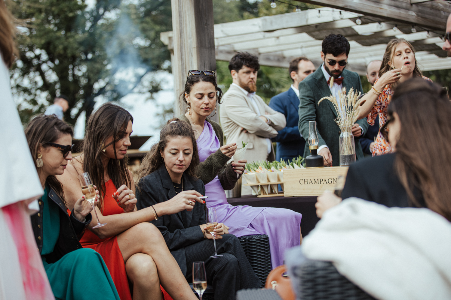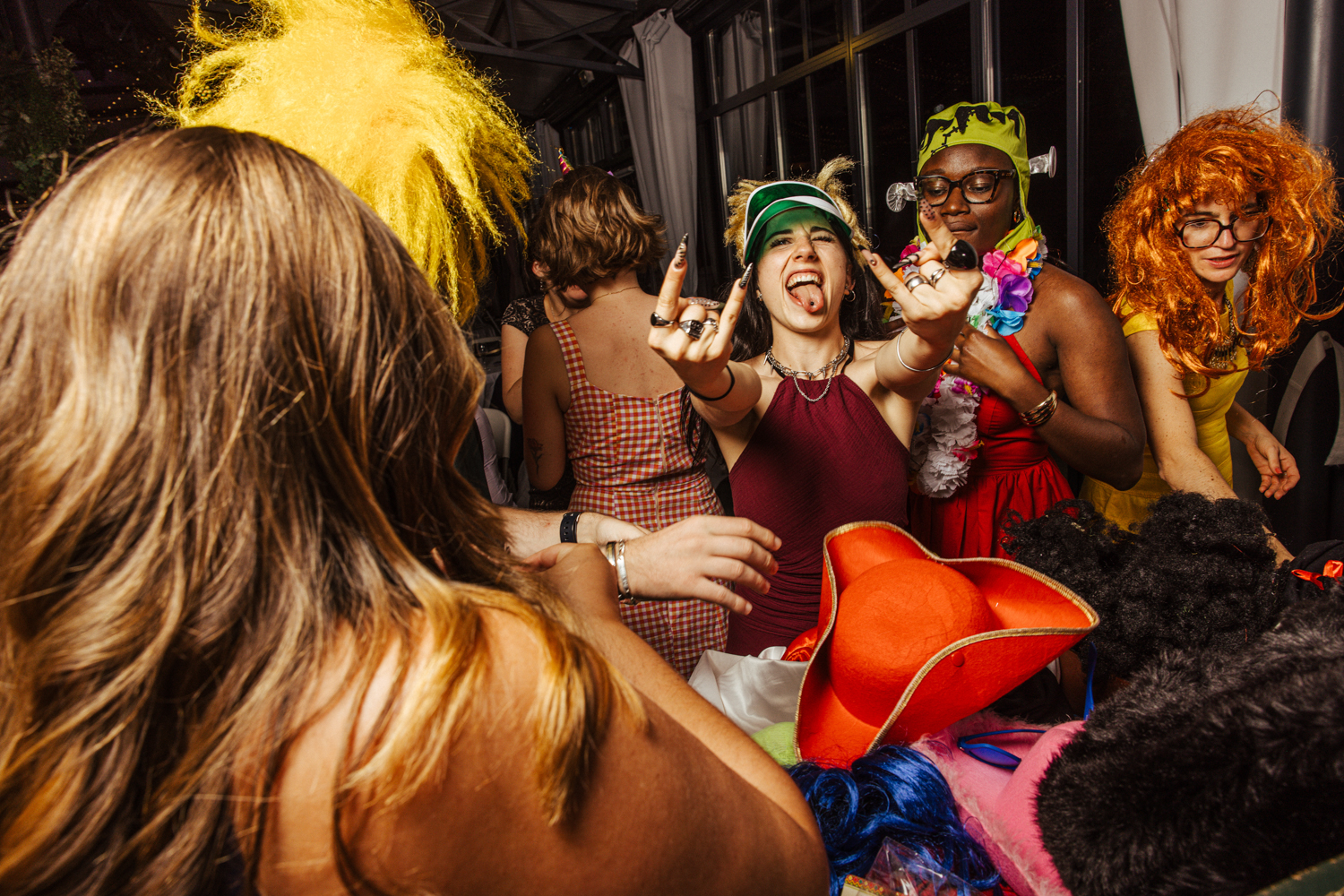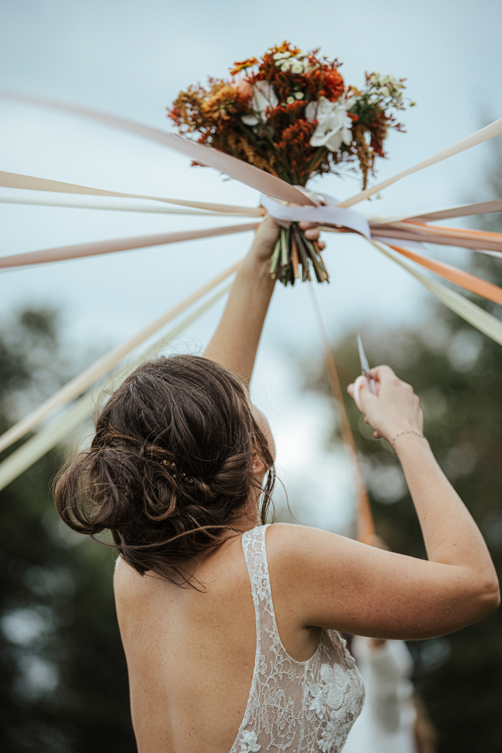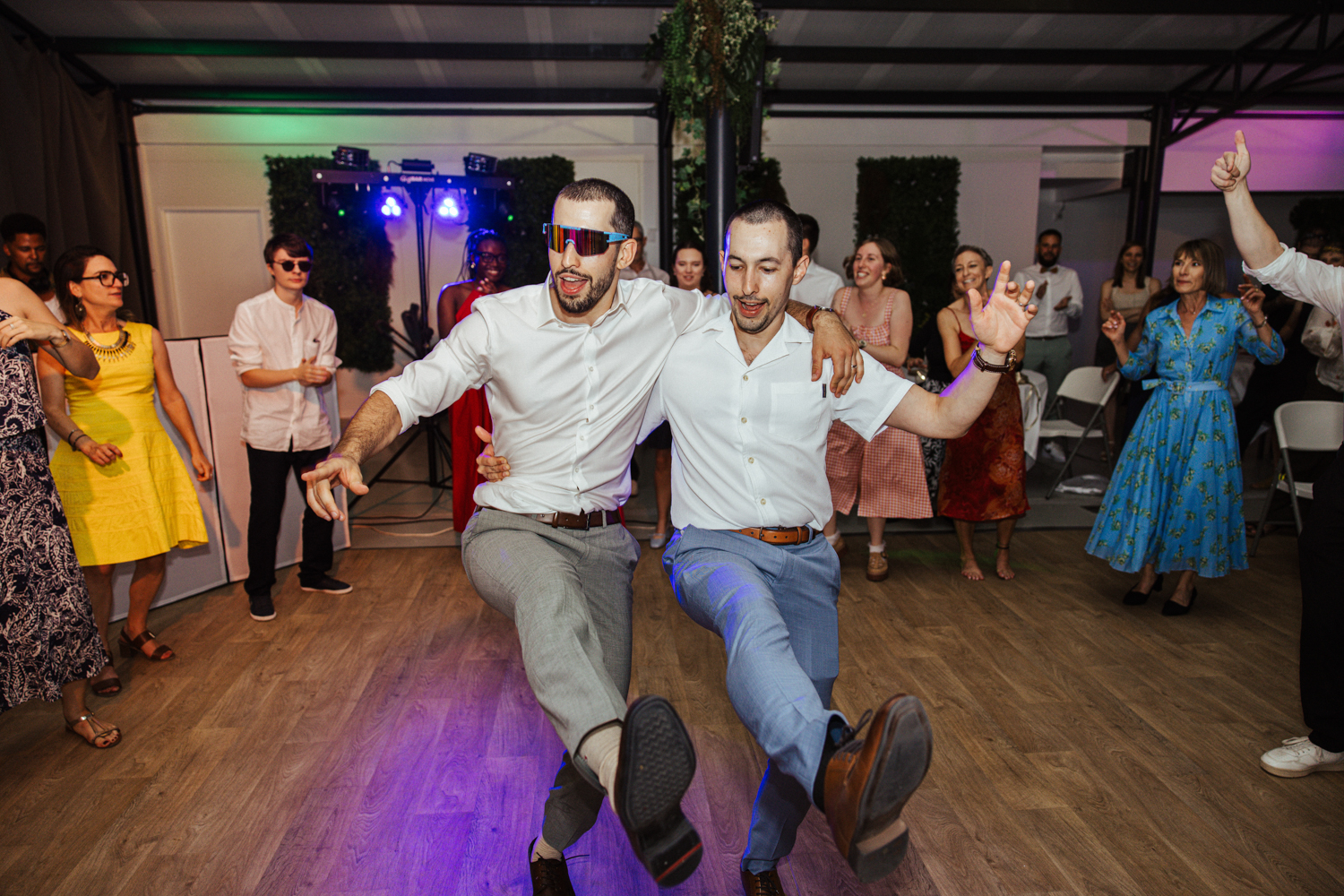 Le soir, je propose une prestation peu courante dans la photographie de mariage: le studio photo. Constitué d’un fond et de deux torches (Elinchrom D-Lite RX4) munies de boîtes de lumière, ce dispositif a le double avantage de produire des photos classes et élégantes d’inspiration Harcourt et des photos de soirée plus décalées avec un maximum de personnes. Avec cette formule, j’assure non seulement à mes clients des photos de soirée de qualité (ce qui est rarement le cas dans un contexte de basse lumière) mais aussi une animation qui fait fureur et lance le dancefloor. Surtout si vos invités cèdent aux sirènes du déguisement.